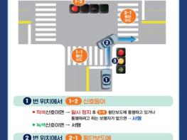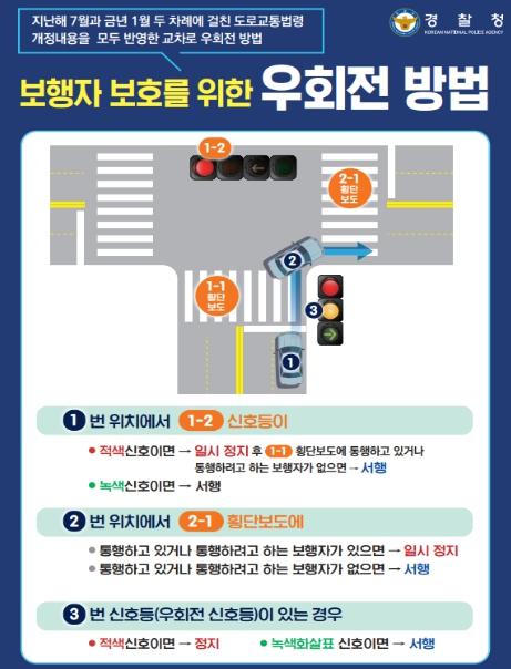 개정 도로교통법 시행규칙은 ? 차량 적색 신호 시 보행자 유무와 관계없이 정지선이나 횡단보도 앞에서 일시 정지한 이후 우회전하도록 하고, ? 우회전 전용 신호등이 설치된 곳에서는 우회전 전용 신호에 따라 진행하도록 하는 내용으로 지난해 1월 22일에 개정되어 올해 1월 22일에 시행됐다.