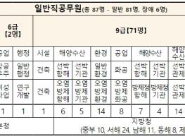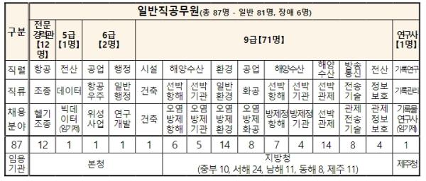 일반직공무원은 총 87명으로 헬기 조종 전문경력관 가군 12명, 빅데이터 5급 1명, 위성 사업 6급 1명, 연구개발 6급 1명, 건축 9급 1명, 해양오염 방제 분야 9급 44명, 선박교통관제 분야 9급 26명 및 기록물 연구 6급 1명을 신규 채용할 예정이다.