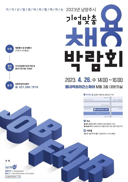 [한국뉴스타임=편집국] 남양주시는 오는 26일 별내동에 위치한 지식산업센터 별내역파라곤스퀘어 대회의실에서 지역 기업의 우수 인력 채용을 위한 ‘2023 기업 맞춤 채용 박람회’를 개최한다.
