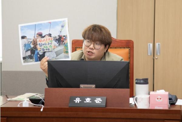 유 의원은 지난 14일 세종정부종합청사에서 열린 ‘414 기후정의파업’에서 만난 초등학생 소녀가 들고 있던 ‘무사히 할머니가 될 수 있을까?’가 적힌 피켓을 보여주며 “오늘 이곳에서 내리는 결정들이 저 아이에게 어떤 의미가 될지, 저 아이가 무사히 할머니가 될 수 있을지, 의원님들이 꼭 답을 주셨으면 한다”며 “나중에 50년, 20년, 10년 뒤에 우리가 탄소중립해야 한다고 말은 하면서, 각종 개발은 하고, 그린벨트 해제 권한 더 달라 요구하고 그린벨트에 캠핑장 더 지을 수 있게 해달라고 요구하는 정치인으로 기억될 것”이라며 미래 세대를 위한 결정을 할 것을 요청했다.