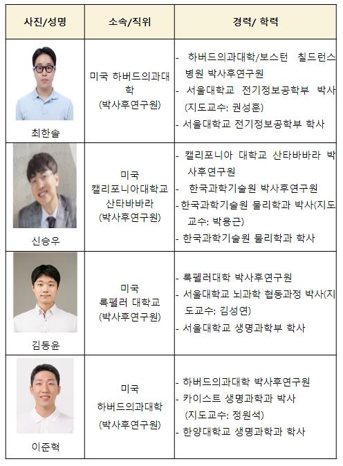 [한국뉴스타임=편집국] 과학기술정보통신부는 최한솔 박사(미국 하버드의과대학교), 신승우 박사(미국 캘리포니아대학교 산타바바라), 김동윤 박사(미국 록펠러대학교), 이준혁 박사(미국 하버드의과대학) 등 한국 연구자 4명이 2023년 휴먼프론티어사이언스프로그램(HFSP)상을 받게 됐다고 밝혔다. 이들은 58개국 429명의 지원자 중 해외연수지원 대상자 총 52명안에 들어 3년 동안 매년 약 6만 달러를 지원받는다.