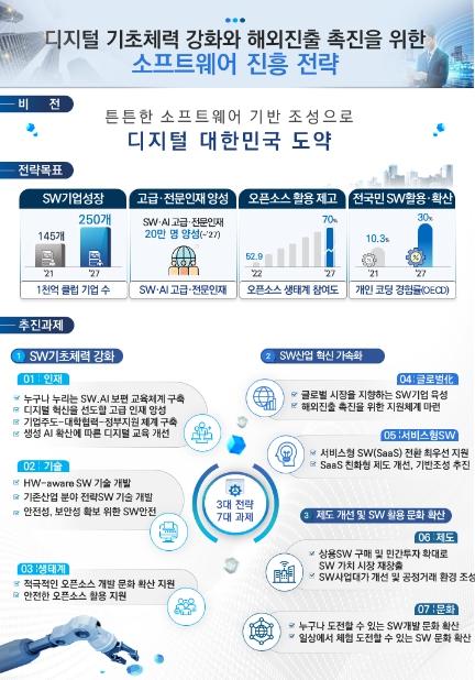 특히 디지털 핵심인재양성, 소프트웨어 기반기술 개발, 오픈소스 생태계 등 다른 디지털 신기술 분야 전략에서 다루기 어려운 디지털의 기반이 되는 대책을 담는데 주력했으며, 글로벌 환경변화에 대응한 소프트웨어 산업의 전면적인 구조개편에 주안점을 두었다.