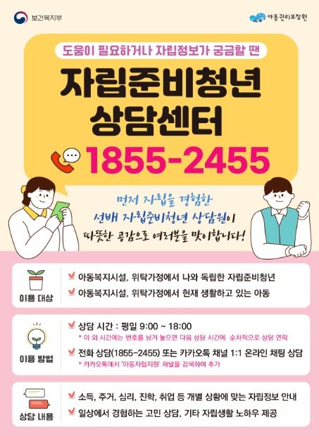 [한국뉴스타임=편집국] 보건복지부는 자립준비청년이 아동복지시설·위탁가정을 떠나 자립하는 과정에서 직면하는 다양한 고민을 털어놓고, 필요한 자립정보를 안내받을 수 있는‘자립준비청년 상담센터’를 4월 24일부터 운영한다고 밝혔다.