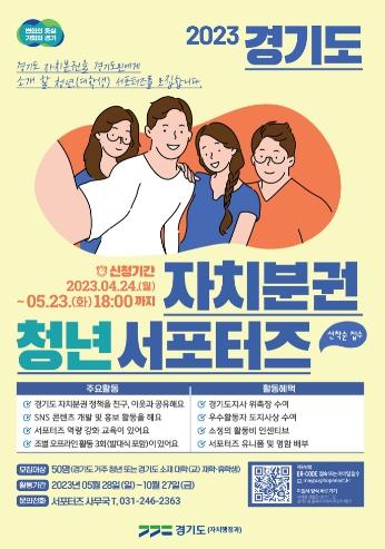 활동기간은 5월 말부터 10월 29일까지로, 경기도에 거주하고 있거나 경기도 소재 대학(교) 재학?휴학생으로 자치분권에 관심이 있는 청년이면 누구나 신청할 수 있다. 24일부터 다음 달 23일까지 포스터에 게시된 큐알(QR) 코드에 접속하거나 전자우편을 통해 신청서를 제출하면 된다.