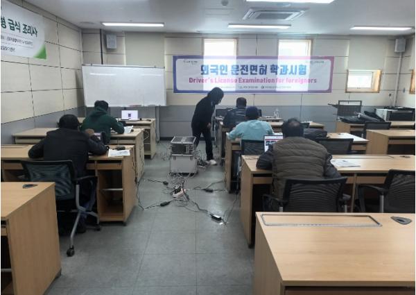 이번 운전면허 학과시험은 지난 4월 22일 경기북부경찰청, 도로교통공단 의정부면허시험장과 협업으로 포천근로자복지관 3층 소강당에서 주말을 이용한 ‘ONE-STOP’ 출장 운전면허 학과시험이다. 이동식 PC에 내장된 시험 서비스를 이용해 많은 외국인 근로자들의 호응을 이끌어 냈다.