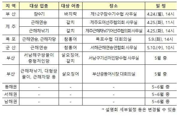 4월 24일 부산, 4월 25일 제주를 시작으로 6월 말까지 동?서?남해권에서 설명회를 진행하며, 5~6월 세부 일정은 어업인 단체 및 지자체 등과 협의하여 정할 예정이다.