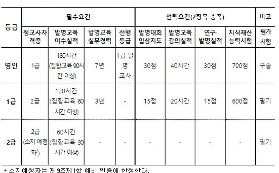 발명교사 인증의 등급은 명인, 1급, 2급으로 구분되며, 발명교육 이수실적·발명교육 실무경력 등 일정 요건을 갖춘자를 대상으로 구술 또는 필기시험을 통해 인증하고, 유효기간은 인증을 받은 날로부터 5년으로 한다.
