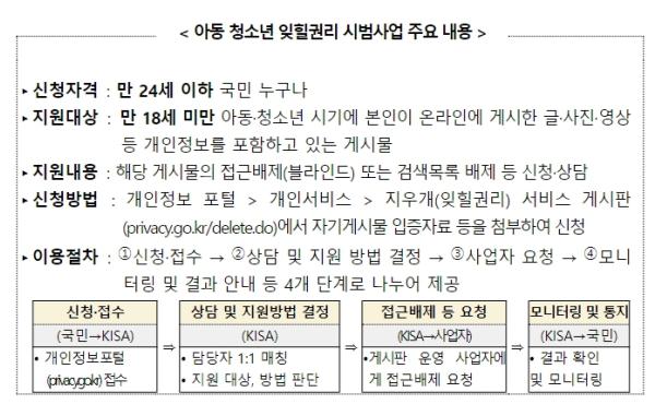개인정보보호위원회는 디지털 세대(Digital Native)인 아동·청소년의 개인정보에 대한 통제권을 강화하기 위한 ‘디지털 잊힐권리 시범사업’을 시작한다고 밝혔다. 보통 아동·청소년은 어린 시절부터 온라인 활동을 활발하게 하는 세대여서 상대적으로 온라인상 많은 개인정보가 장기간 누적되는 경향이 있다. 이에 비해 누적된 개인정보에 대한 삭제나 처리정지를 요구하기는 쉽지 않다. 이번 시범사업은 이러한 어려움을 겪는 아동·청소년이 개인정보 자기결정권을 실질적으로 행사할 수 있도록 지원하는 사업이다.