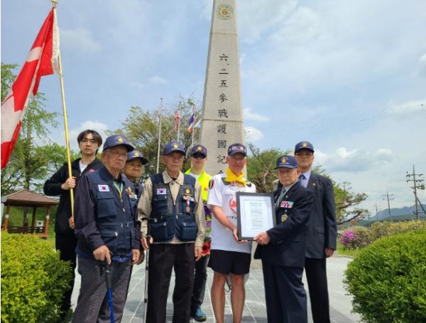 지난 14일 한국인 부인과 아들 등 일행 4명과 함께 캐나다에서 대장정을 시작한 가이블랙씨는 24일 포천시 이일선 복지정책과장, 5군단 유해발굴단 5명 및 영북면 산악회 회장 등과 함께 캐나다 군대가 전투에 참여했던 포천시 영북면 각흘봉 정상에 올라 현장에서 전사한 캐나다 참전용사들에 대해 묵념하고, 영북면 구름내현충공원 내에 있는 6.25참전기념비에서 헌화했다.