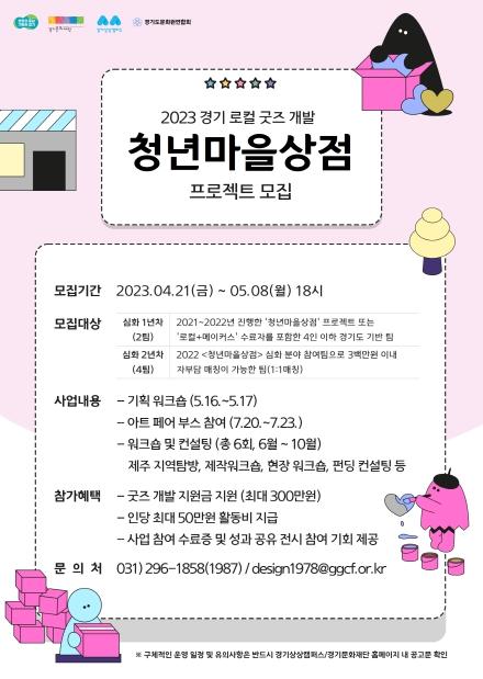경기문화재단(대표이사 유인택) 경기상상캠퍼스가 4월 21일부터 5월 8일까지 2023 경기 로컬 굿즈 개발 '청년마을상점' 프로젝트의 참여자를 모집한다.