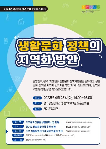 경기문화재단(대표 유인택)은 4월 25일에 ‘생활문화정책 지역화 방안’을 주제로 2023년 첫 번째 문화정책 토론회를 열었다. 이 토론회는 최근 현 정부의 지역문화진흥 이행전략 등 정책 이슈에 따른 경기도 문화정책의 방향을 가늠해보기 위해 열린 첫 번째 토론회로 중앙정부와 광역지자체, 기초지자체의 생활문화 정책 현황을 공유하고 이를 지역에서 활성화할 수 있는 방향과 체계, 그리고 역할 분담 등에 대한 논의가 이뤄졌다.