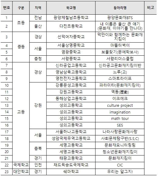 ‘청소년문화재지킴이’는 학교(동아리) 단위로 지도교사와 학생이 주도적으로 문화재지킴이 활동에 참여하도록 매년 공모를 통해 선정하고 있다. 심사 결과 ▲ 초등학교 2개(전남, 광양제철남초 등), ▲ 중학교 4개(경북, 선덕여중 등), ▲ 고등학교 7개(강원, 강릉문성고 등), ▲ 국제학교 1개(인천, 채드윅송도국제학교), ▲ 대안학교 1개(경기, 쉐마학교) 등 총 23개의 학교(동아리)가 최종 선정됐다.