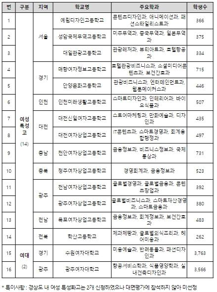 이번에 선정된 학교는 총 16개교로 여성 특성화고는 수도권 6개교와 비수도권에 8개교이며 대학은 수도권에 수원여대와 비수도권에 광주여대가 선정됐다.