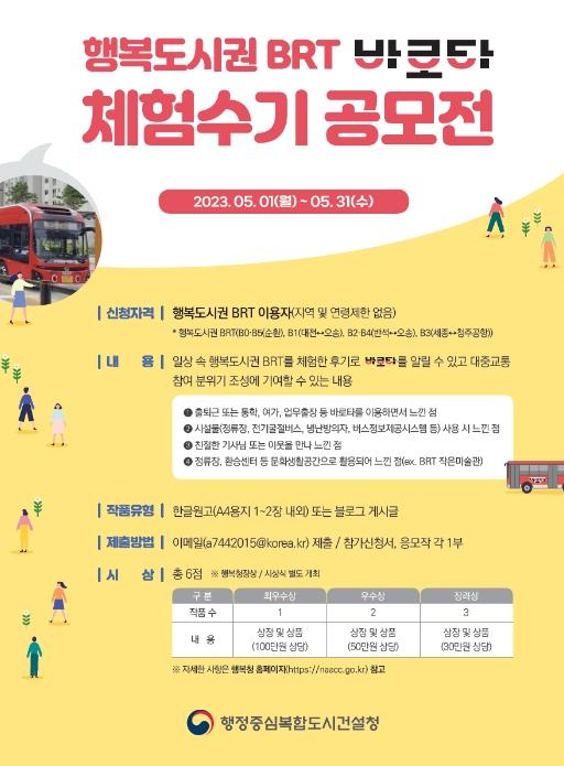 [한국뉴스타임=편집국] 행정중심복합도시건설청이 행복도시권 비알티(BRT)‘바로타’체험수기 공모전을 5월 1일부터 5월 31일까지 개최한다.