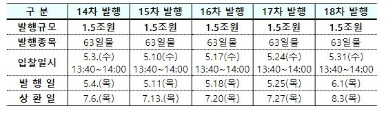 정부는 세입과 세출간 시기가 불일치하여 발생하는 일시적인 자금부족을 메우기 위해 연도 내에 상환해야하는 단기 국채(63일물)인 재정증권과 한국은행 일시차입을 활용하고 있다. 5월에는 매주 1.5조원씩 5차례에 걸쳐 7.5조원의 재정증권을 발행하고, 이 중 5조원은 5월에 만기가 도래하는 3월 발행분 상환에 활용될 예정이다.