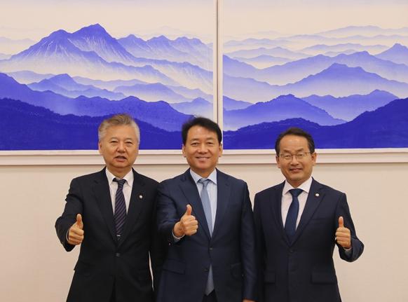[한국뉴스타임=편집국] 더불어민주당 홍성국 세종시당위원장과 강준현 세종을지역위원장은 4월 26일 오전, 이광재 국회사무총장을 접견해 환담을 나눴다. 이어, 사무총장과 함께 국회세종의사당추진단을 방문해 국회세종의사당 설치를 위해 노력하는 실무진을 격려하고, 국회 차원에서의 지원과 협력을 함께 당부했다.