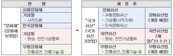 이번 제정 법률안이 대통령 재가를 거쳐 공포되면, 국가유산기본법이 국가유산 보호 정책의 최상위 기본법으로 자리하고, 그 아래 국가유산의 유형별로 3개의 유산법(△문화유산법, △자연유산법 △무형유산법)을 새롭게 재편 및 정비하여 1년 후인 2024년 5월부터는 새로운 국가유산 체제로 전환할 수 있게 될 것이다.