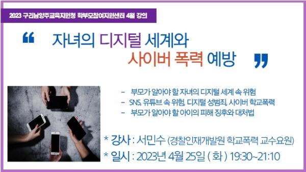 4월 25일 서민수 강사(경찰인재개발원 교수)는 '자녀의 디지털 세계와 사이버폭력 예방'라는 제목으로 ▲부모가 알아야 할 자녀의 디지털 세계의 위험 ▲SNS, 유튜브 속 위험, 디지털 성범죄, 사이버 학교폭력 ▲부모가 알아야 할 아이의 피해 징후와 대처법을 연수했다.