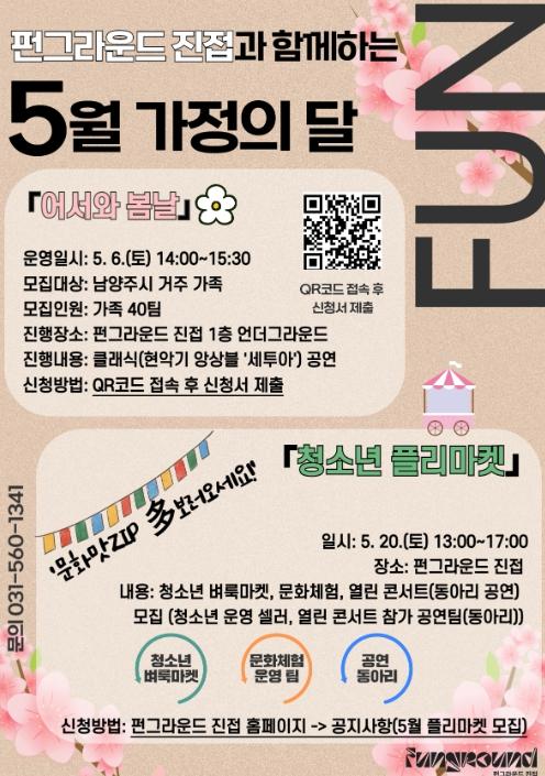 [한국뉴스타임=편집국] 남양주시 펀그라운드 진접에서는 5월 가정의 달을 맞아 청소년과 가족을 대상으로 한 클래식 앙상블 공연과 플리 마켓 축제 등 다채로운 문화 행사가 개최된다.