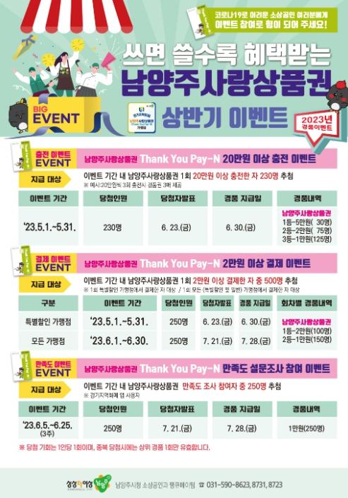 [한국뉴스타임=편집국] 남양주시는 남양주사랑상품권(Thank You Pay-N)의 이용을 활성화하고, 코로나19로 힘들었던 소상공인을 응원하기 위해 쓰면 쓸수록 혜택받는 ‘2023 남양주사랑상품권 상반기 경품 이벤트’를 실시한다.