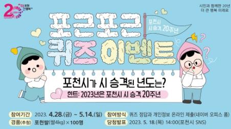 이벤트 기간은 오는 5월 14일까지며, 참여 방법은 포천시청 SNS(페이스북, 인스타 그램, 카카오스토리, 블로그)에 질문 ‘포천시가 시 승격된 연도는?’의 정답을 네이버 폼에 개인 정보와 함께 입력하면 된다. 힌트는 ‘2023년은 포천시가 시 승격 된 지 20주년이 된 해’다.