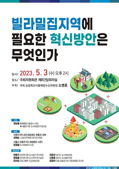 [한국뉴스타임=편집국] 더불어민주당 소병훈 국회의원(경기 광주시갑·국회 농림축산식품해양수산위원장)이 5월 3일 오후 2시, 국회 제8간담회의실에서 '빌라 밀집 지역에 필요한 혁신방안은 무엇인가' 토론회를 개최한다.