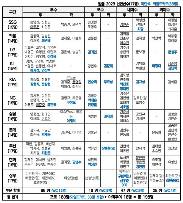 대표팀 예비 명단으로는 만 25세 이하 또는 입단 4년 차 이하 선수 147명(신인 17명)과 와일드카드 33명 등 프로 180명(투수 86명, 포수 19명, 내야수 47명, 외야수 28명)과 아마추어 선수 18명(투수 10명)까지 총 198명의 선수가 선발되어 대한야구소프트볼협회를 통해 대한체육회에 제출됐다.