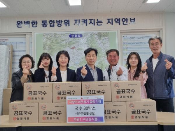 [한국뉴스타임=편집국] 군내면은 지난 4월 27일 군내면 소재 기업체 ㈜영동식품으로부터 국수 30박스(금100만 원 상당)를 각 리 경로당으로 전달해 달라며 경기 사회복지공동모금회를 통해 기탁했다고 전했다.
