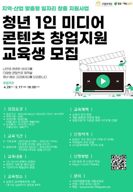 앞서 시는 고용노동부에 지난 3월‘청년 1인 미디어 콘텐츠 창업지원’사업 계획을 최종 승인받아 국비 7천만 원을 확보했으며, 사업 제안자인 사회적 협동조합‘사람과세상’과 업무협약을 체결했다.