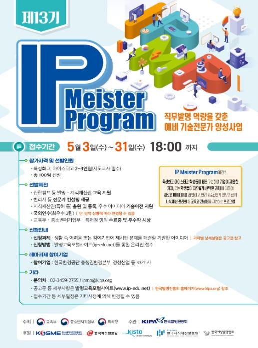 특허청은 교육부·중소벤처기업부와 공동으로 직업계고 학생들에게 지식재산 창출 및 활용 전 과정을 지원하는 '제13기 지식재산(IP) 장인(마이스터) 프로그램' 참가자를 5월 3일(수)부터 31일(수)까지 모집한다.