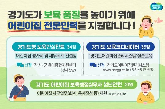 [한국뉴스타임=편집국] 경기도는 보육 품질을 높이기 위해 경기도형 보육컨설턴트, 보육행정실무사 청년인턴, 보육코디네이터 등 인력 지원사업을 추진 중이라고 2일 밝혔다.
