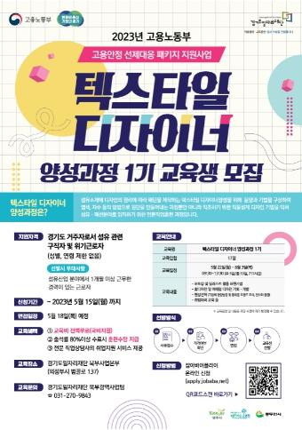 [한국뉴스타임=편집국] 경기도와 경기도일자리재단이 경기북부 섬유산업 활성화와 일자리 창출을 위해 고부가가치 상품 개발인력을 양성하는 ‘텍스타일 디자이너 양성 과정’ 1기 교육생을 모집한다.