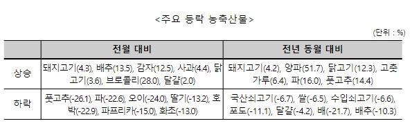 [한국뉴스타임=편집국] 농림축산식품부는 채소류 등 하락 영향으로 4월 농축산물 소비자물가가 전월 대비 1.8% 하락했다고 밝혔다. 5월 이후에도 기온 상승, 봄철 생산물 출하, 가축 생산성 회복 등으로 공급 여건이 개선되어 안정세를 유지할 것으로 전망된다고 밝혔다.