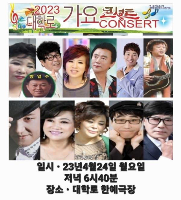 [한국뉴스타임=편집국] 4월24일 월요일 저녁 6시40분부터 대학로 한예극장에서 나래기획 주최로 2023 대학로 가요콘서트가 출연자 사회 방일수(코미디언).박일준.정지연.마도로스박.백청혜.프레스리.이사람.배서연.신일국.김부여.윤현수의 무대열창으로 성대히 콘서트를 마쳤다.