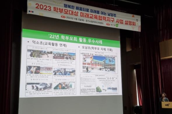 [한국뉴스타임=편집국] 남양주시는 2일 경기시청자미디어센터에서 ‘2023 학부모 대상 미래교육협력지구 사업 설명회’를 개최하고, 초·중·고 학부모회 임원과 올해 남양주시 교육사업에 대해 논의하는 시간을 가졌다.