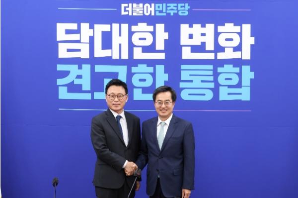 이날 오후 2시 박광온 더불어민주당 원내대표를 만난 김 지사는 “민주당의 원내 사령탑 취임을 축하드린다”라며 “쇄신과 통합에 대해 뜻을 같이한다는 말씀을 드리고 경기지사인 제 입장에서는 민주당이 추구하는 가치와 비전 그리고 정책을 가장 잘 구현하는 모범을 보이겠다”라고 말했다.