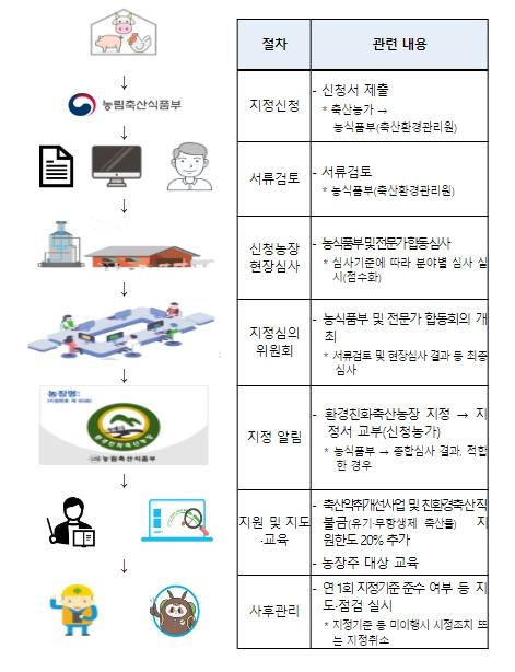 지정을 희망하는 농가는 신청서 및 첨부서류를 갖춰 농식품부 또는 축산환경관리원에 제출하면 된다. 신청서가 접수되면 서류검토, 현장심사 등을 거쳐 신청 후 50일 이내에 환경친화축산농장으로 지정받게 된다.