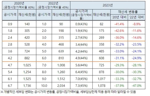 2023년 1주택자 공정시장가액비율을 43~45%로 설정함에 따라 납세자 세부담(’22년 공시가격 1~10억 기준)은 2020년 대비 29.3%~42.6% 감소할 것으로 예상되며, 2022년 대비 8.9~47% 감소할 것으로 예상된다.