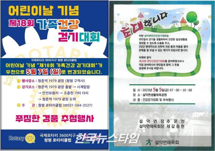 설악면 체육회 주관으로 설악면생활체육공원에서 5월 5일 아침 7시부터 개최되는 '설악면민건강걷기대회‘도 5월 7일 일요일 오전 07시로 일정을 긴급 변경하였다고 전했다.
