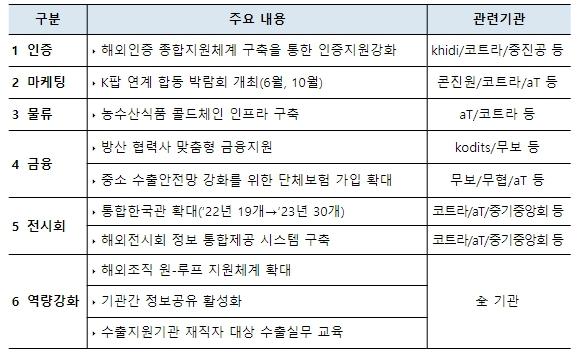 아울러 한류 연계 합동 박람회 개최, 해외전시회 정보 통합제공 시스템 구축, 콜드체인 인프라 구축, 방산 맞춤형 수출금융지원 등 수출지원기관 간 협업 사업을 발굴하고 구체적인 이행계획을 마련하여 신속히 추진해 나가기로 했다.