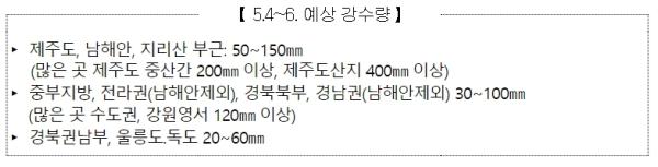 기상청에 따르면, 오늘 오후부터 비가 내리기 시작해 6일까지 남해안, 지리산부근, 제주도를 중심으로 많은 비가 올 것으로 예상되며, 중부지방에도 많은 강수량이 예상된다.