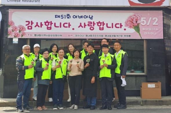특히, 이번 행사에는 마차이나 중식당(대표 서재덕)에서 어르신 40여 분에게 식사를 제공하고, 평내동 주민자치회(회장 반성숙)에서 생화 카네이션, 평내동 생활개선회(회장 박미경)에서 천연샴푸와 천연비누, 짬갬뽕(대표 임수지)에서 도시락 볶음밥 60세트, 호평동 종로떡전문점(대표 정태창)에서 절편 떡 등을 후원하는 등 지역사회 내 다양한 곳에서 어르신들께 감사와 사랑의 마음을 전했다.