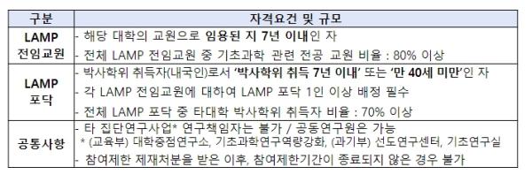 대학의 핵심 연구인력임에도 지원이 상대적으로 부족했던 박사후연구원(포닥, post-doc)과 신진교원을 집중적으로 지원한다. 그간 교육부의 대학재정지원사업은 학부생·대학원생을 중심으로, 대학중점연구소 사업은 중견교원을 중심으로 지원이 이루어졌다. 램프 사업은 젊고 유능한 박사후연구원의 유입을 지원함으로써 대학의 연구력을 보강할 뿐 아니라, 다양성과 새로움의 자극을 더해 대학 내 연구 분위기도 긍정적으로 개선할 수 있도록 돕는다. 또한, 임용된 지 7년 이내의 교원이 사업에 주도적으로 참여할 수 있게 함으로써 역량 있는 신진교원들이 연구 잠재성과 창의성을 충분히 발휘할 수 있도록 지원한다.