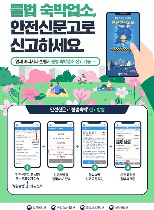 영업신고를 하지 않고 영업하는 업소나 영업 요건을 지키지 않고 영업하는 업소 등 불법 숙박업소를 발견하셨다면 ‘안전신문고’를 찾아주세요!