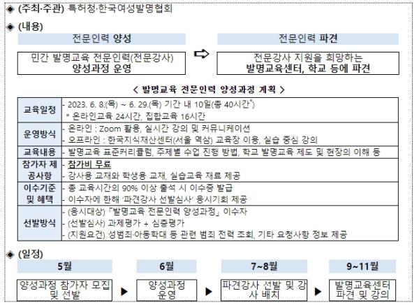 또한 발명교육 분야 민간 전문강사를 양성하여 학교현장에 파견하는'민간 발명교육 전문인력 양성 사업'도 새롭게 시작한다.