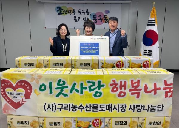 [한국뉴스타임=편집국] 구리시 동구동 행정복지센터(동장 김병선)는 지난 3일 다가오는 어버이날을 맞아 (사)구리농수산물도매시장 사랑나눔단(이사장 신현철)으로부터 동구동 소재 경로당을 위한 후원품(참외 25박스)을 전달받았다.