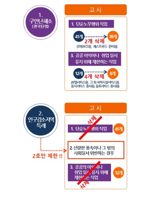 주방보조원, 호텔서비스원 등 분야는 다른 분야에 비하여 인력 부족률이 높아, 농림축산식품부, 문화체육관광부 등 관계부처와 해당 분야 취업 제한 완화에 대해 지속 협의한 결과, 주방보조원, 호텔서비스원 등 6개 직종에 대하여 재외동포(F-4)의 취업을 허용했다.