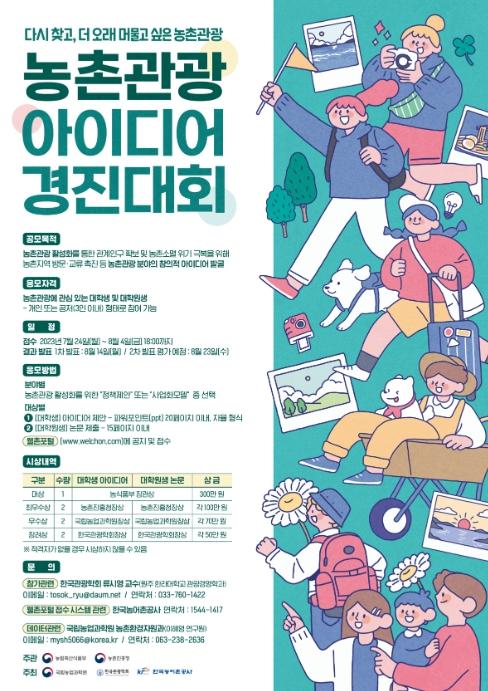 [한국뉴스타임=편집국] 농림축산식품부와 농촌진흥청은 “다시 찾고, 더 오래 머물고 싶은 농촌관광”이란 주제로 국내 대학(원)생 대상 ‘농촌관광 아이디어 경진대회’를 공동 개최한다.