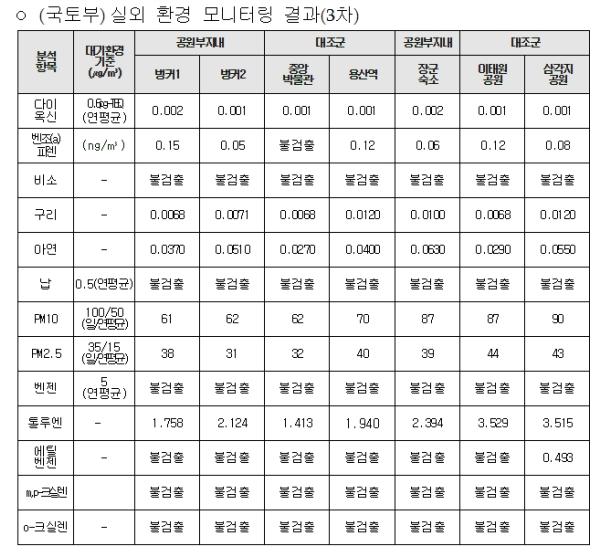 7일 환경부와 국토부에 따르면, 용산어린이정원에 대해 최근 6개월 동안 3차례 대기 중 오염도를 측정하는 환경 모니터링을 시행한 결과, 대기 환경 안전성 기준을 만족했으며 어린이들이 뛰노는 이태원·삼각지 어린이공원이나 불특정 다수의 국민들이 상시 이용하는 국립중앙박물관, 용산역과 비슷한 수준임을 확인했다.