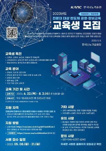 [한국뉴스타임=편집국] 경기도와 한국나노기술원이 도내 전문대졸업(예정)자 대상 2023년도 반도체 공정·장비 교육생을 8일부터 21일까지 모집한다.